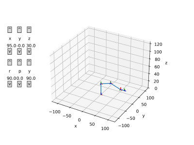 The simulation program uses matplotlib to plot lines representing the links of the robot arm, as well as the coordinate frames of each joint. This was my first time writing a non-trivial object-oriented program, and I learnt lots about classes in Python and structuring code in general. It makes use of the model-view-controller pattern, which keeps the code nice and organised.